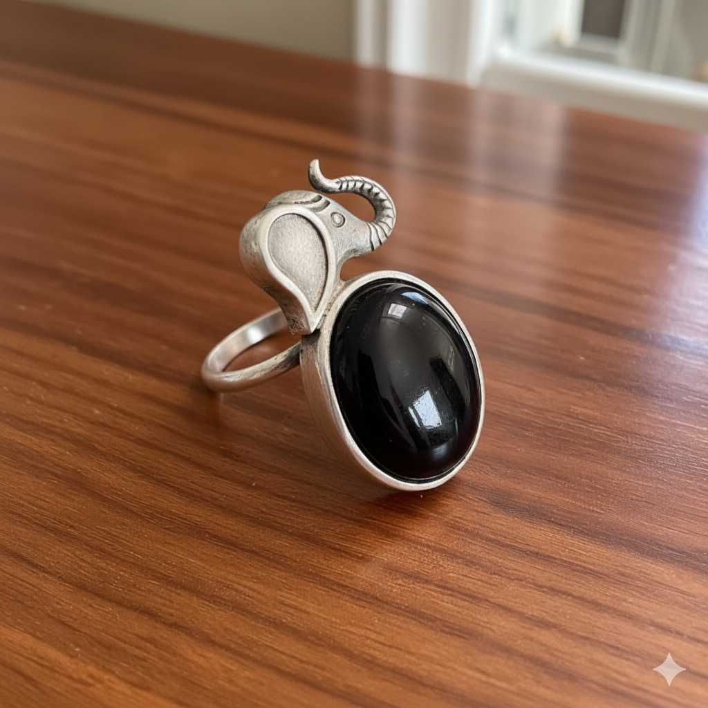 This handcrafted oxidized silver ring features a striking elephant motif, symbolizing strength and wisdom. The bold stone at the center adds a vibrant contrast, exuding elegance and cultural charm. Perfect for statement styling, it blends traditional artistry with a touch of modern flair. Ideal for festive wear or ethnic ensembles, this unique piece celebrates heritage with a contemporary twist. Adjustable band ensures a comfortable fit.