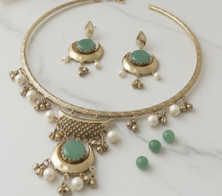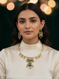 Radiate effortless grace with the Amaira hasli, featuring a delicate gold-plated choker adorned with lustrous pearls and a rich green stone centerpiece. The matching earrings mirror the same timeless beauty, making this set a perfect pick for festive celebrations, weddings, or elegant evening gatherings.