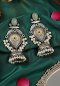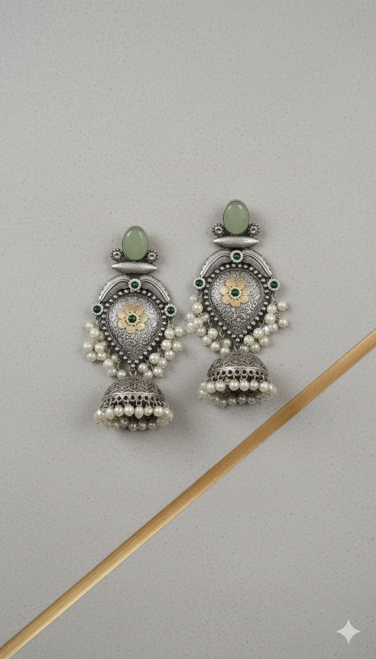 Embrace timeless elegance with these oxidized silver jhumka earrings adorned with intricate floral motifs and antique detailing. The statement design features a striking mint-green stone centerpiece paired with a teardrop gemstone on top, enhanced by delicate pearl danglings that add a soft, graceful movement. Perfect for festive occasions and traditional wear, these earrings beautifully blend vintage artistry with modern charm, making them a must-have for every ethnic jewellery collection.