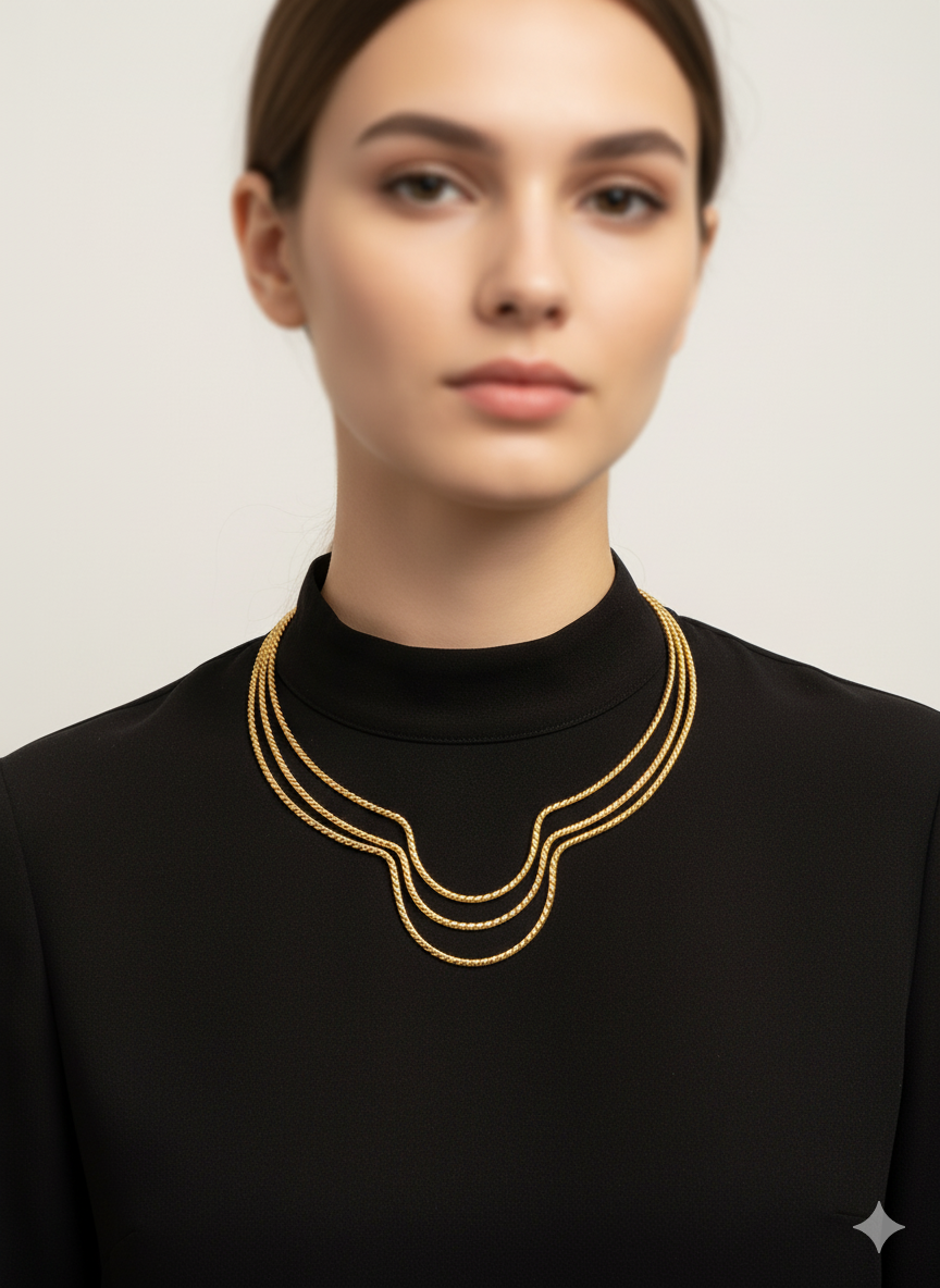 Style Guide: Since a Hasli necklace sits close to the neck, it pairs well with outfits that have a wide or deep neckline. Consider wearing it with scoop necks, V-necks, or boat necks to showcase the necklace prominently.