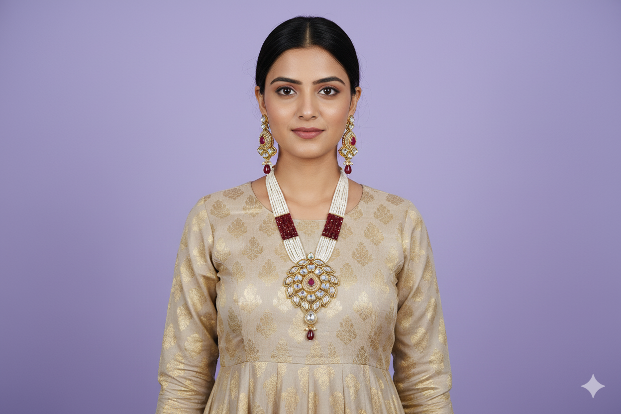 Matching Statement Earrings: Chandelier-style earrings with Kundan and pearl embellishments for a coordinated look