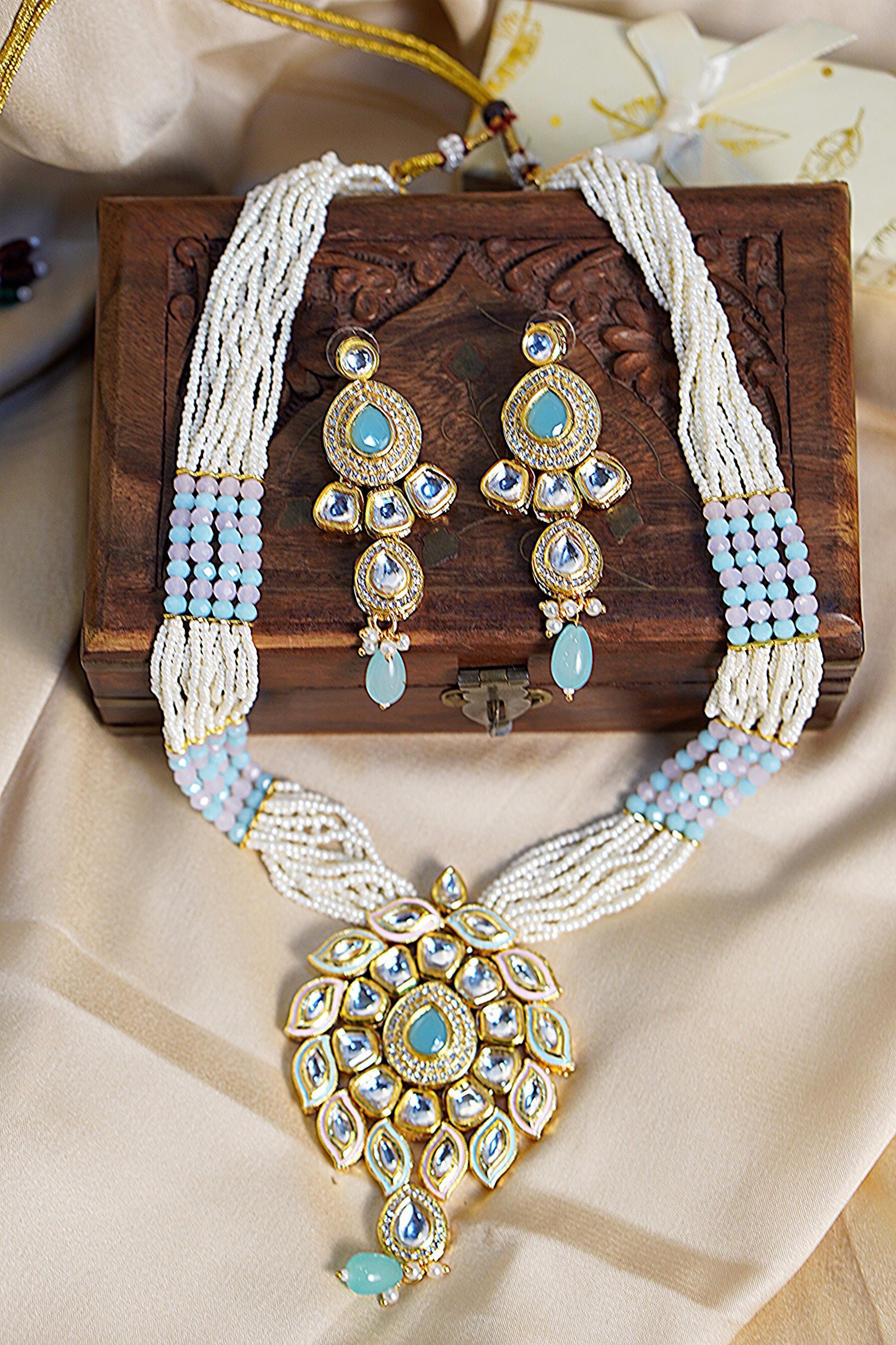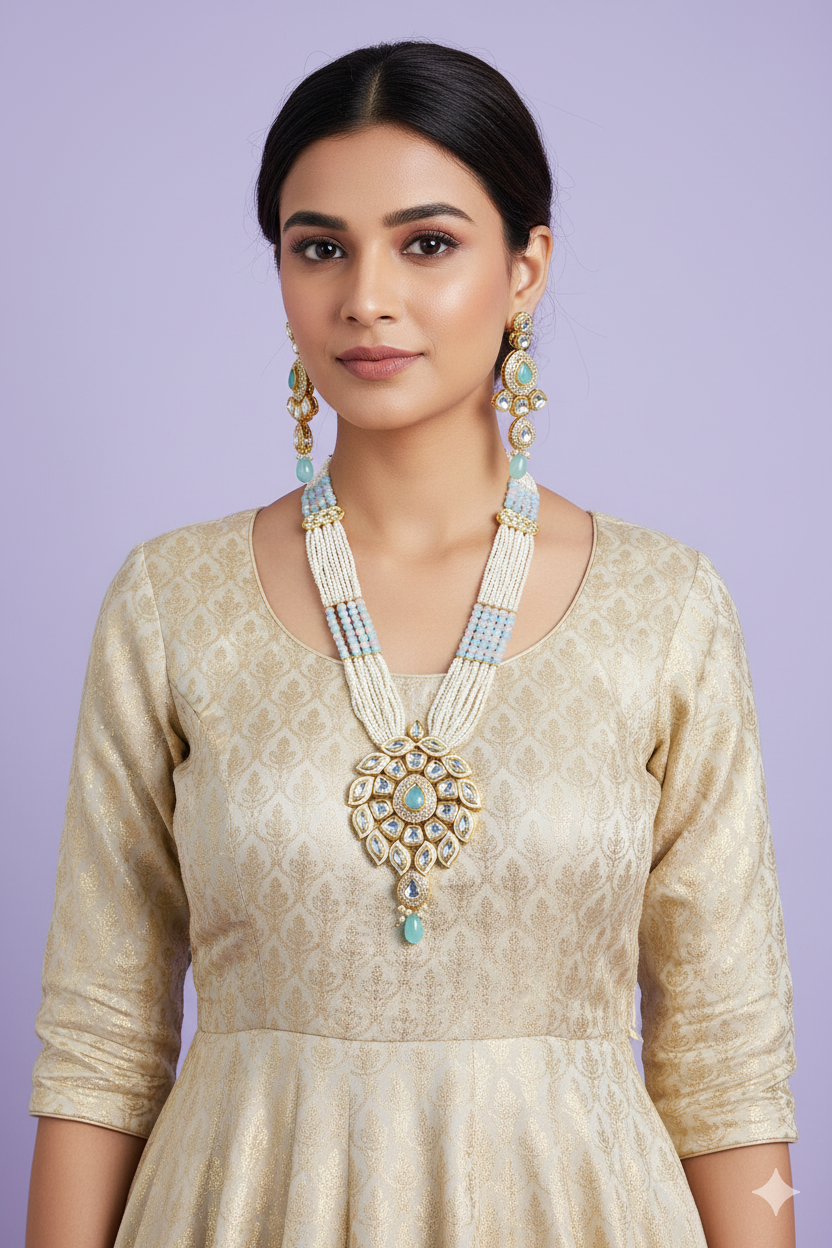 Elevate your traditional elegance with this exquisite handcrafted Indian necklace set, a perfect blend of timeless artistry and modern sophistication. The set features a majestic statement necklace adorned with intricate Kundan work, embellished with lustrous pearls and soft aqua gemstones. The multi-strand pearl design gracefully complements the central pendant, which showcases a floral motif encased in delicate gold plating and sparkling kundan stones, radiating regal charm.