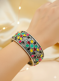 Add a vibrant touch of tradition to your jewelry collection with these exquisitely handcrafted oxidized bangles. Adorned with intricate floral patterns filled with vivid multicolor enamel, these bangles offer a perfect fusion of ethnic charm and modern flair. The oxidized silver finish gives them a timeless vintage appeal, while the secure clasp ensures a snug and comfortable fit. Ideal for festive occasions, cultural celebrations, or pairing with your favorite ethnic wear, these bangles are a versatile addition to your accessory wardrobe. Whether you're dressing up for a wedding or looking to elevate your everyday ethnic style, these bangles make a striking statement.