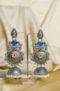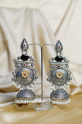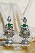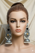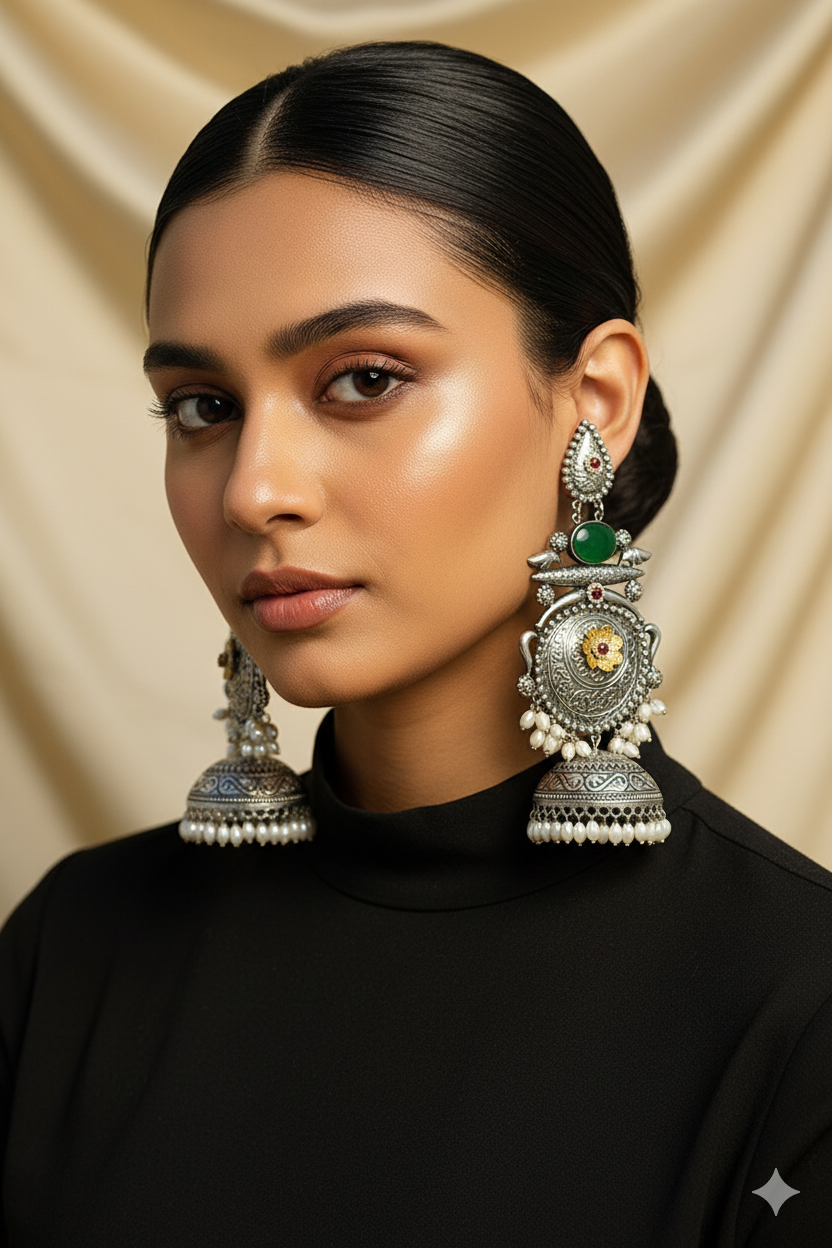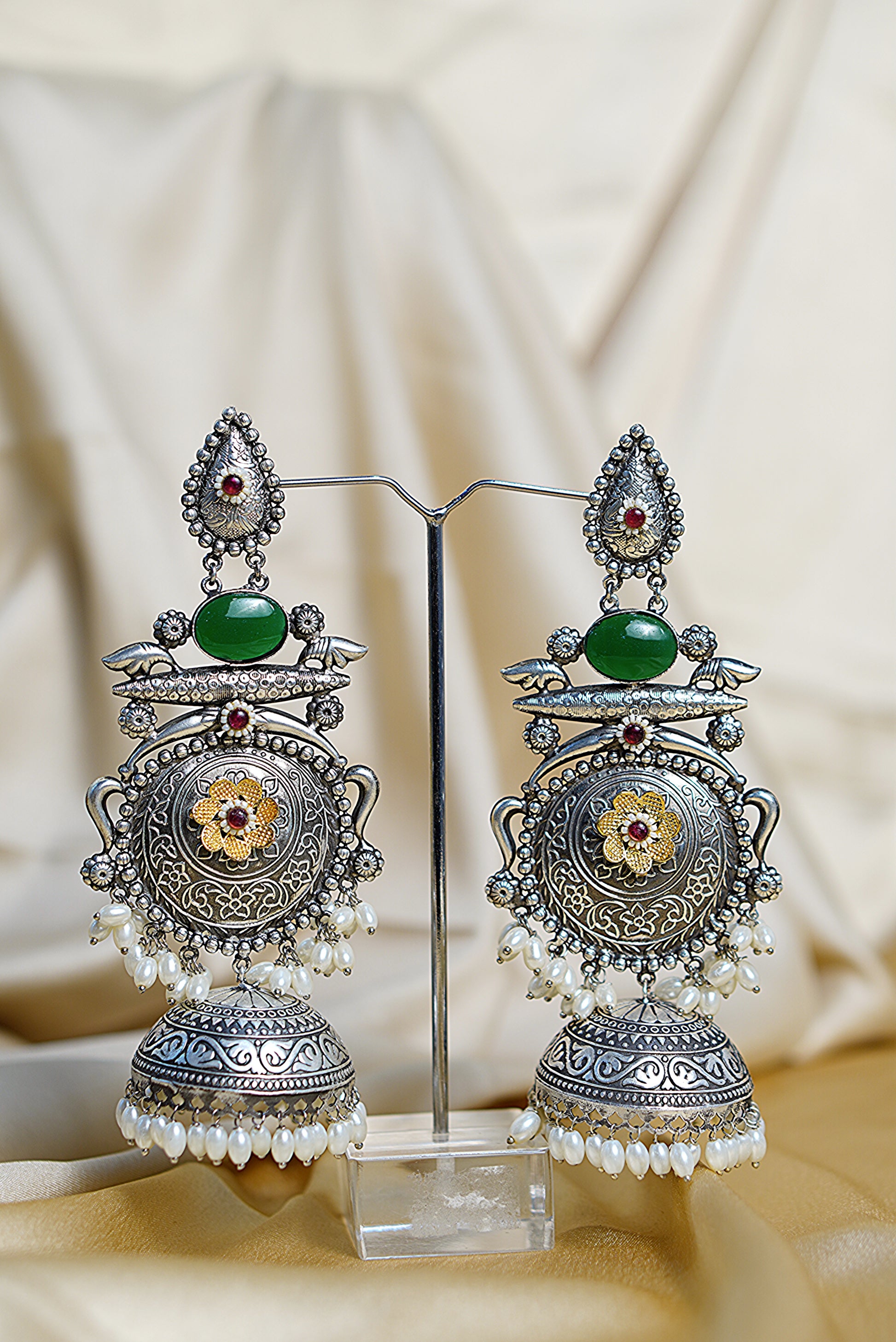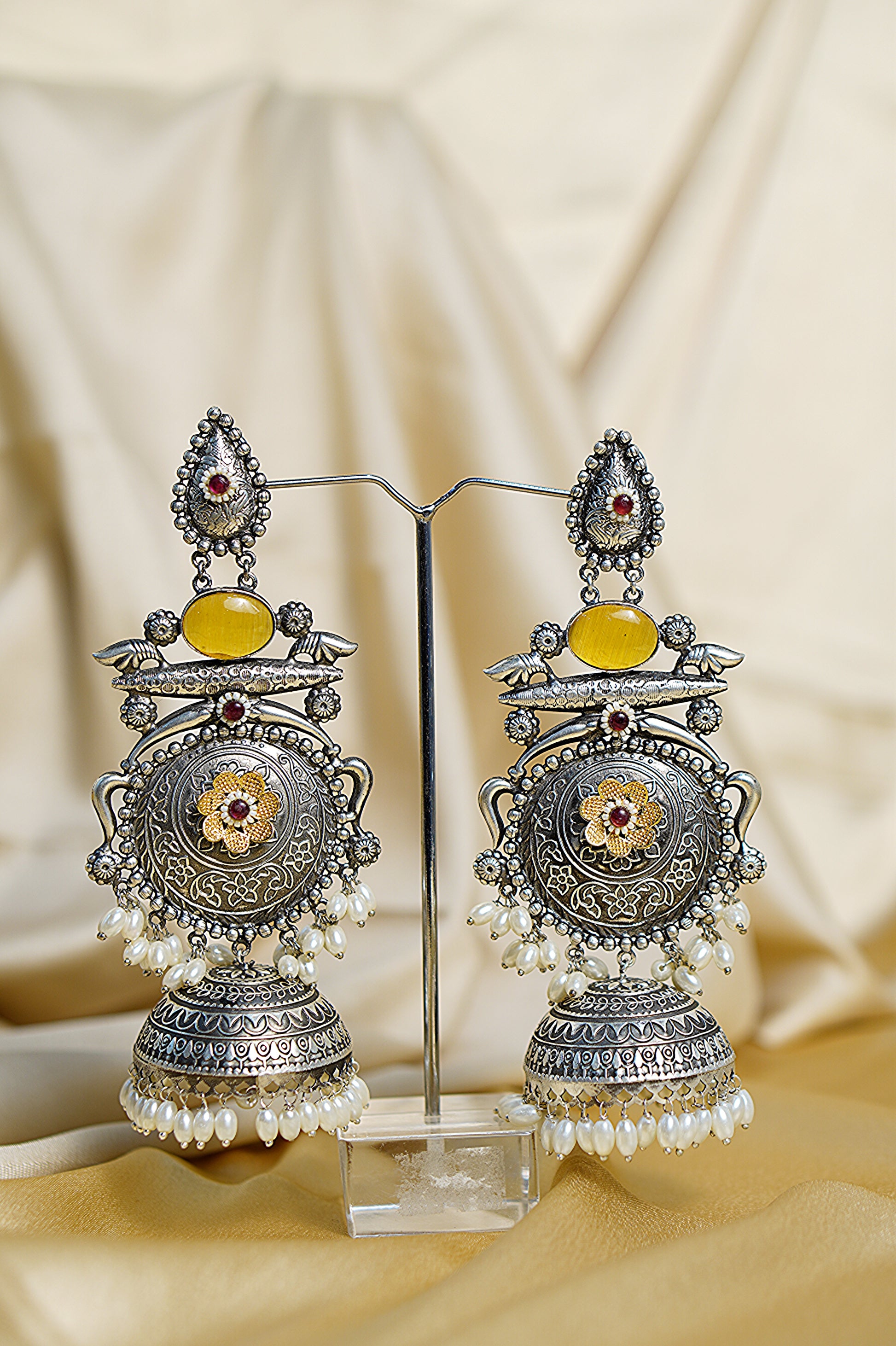 Step into elegance with these stunning oxidized silver jhumkas, crafted with intricate floral engravings and royal detailing. The centerpiece features a golden flower motif accentuated by a touch of red, symbolizing tradition and grace. A rich mustard-yellow gemstone at the top adds a regal charm, while delicate pearl droplets lend a soft, graceful finish. Perfect for festive occasions, weddings, and traditional outfits, these earrings blend timeless craftsmanship with heritage-inspired beauty.