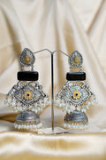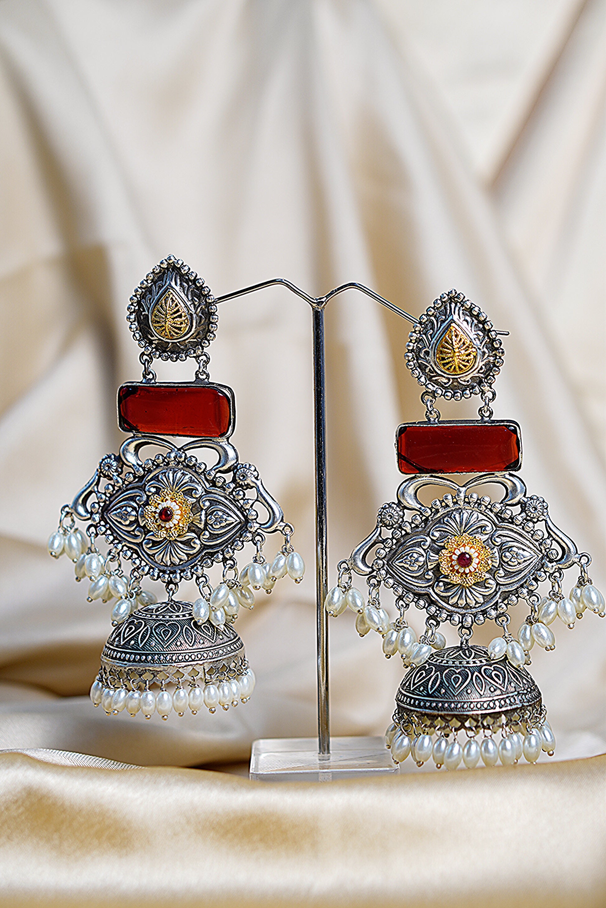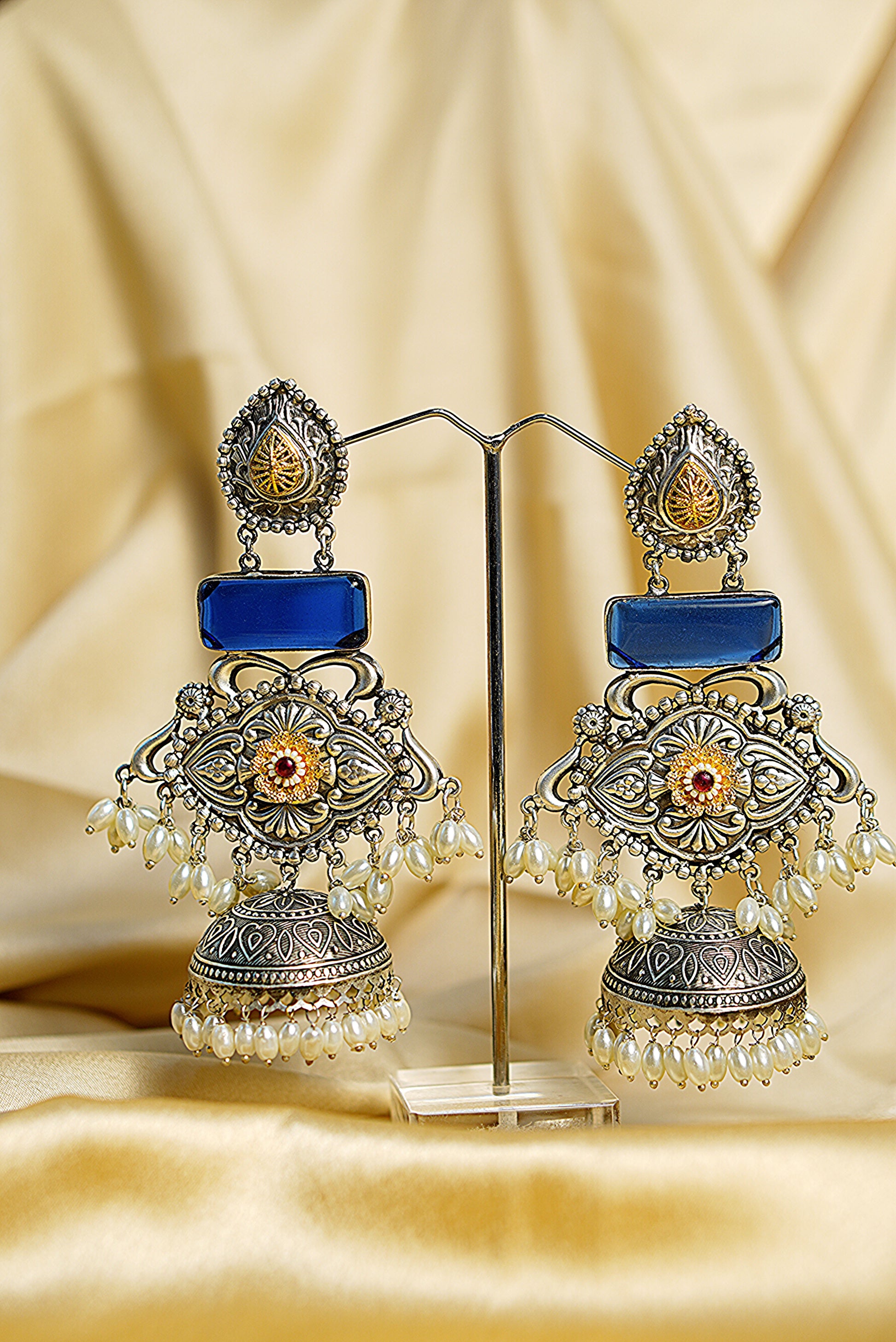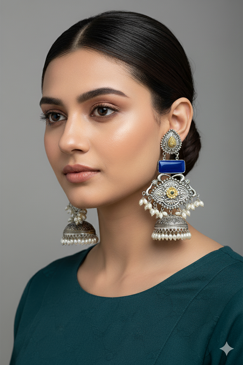Step into timeless elegance with these handcrafted oxidized silver jhumka earrings. Adorned with intricate floral engravings, golden detailing, and luminous pearl droplets, this pair beautifully blends traditional artistry with royal sophistication. The black, blue and red stone accent adds a bold contrast, making it perfect for festive occasions or ethnic celebrations. Lightweight yet statement-worthy, these earrings complement sarees, lehengas, and Indo-fusion outfits effortlessly.