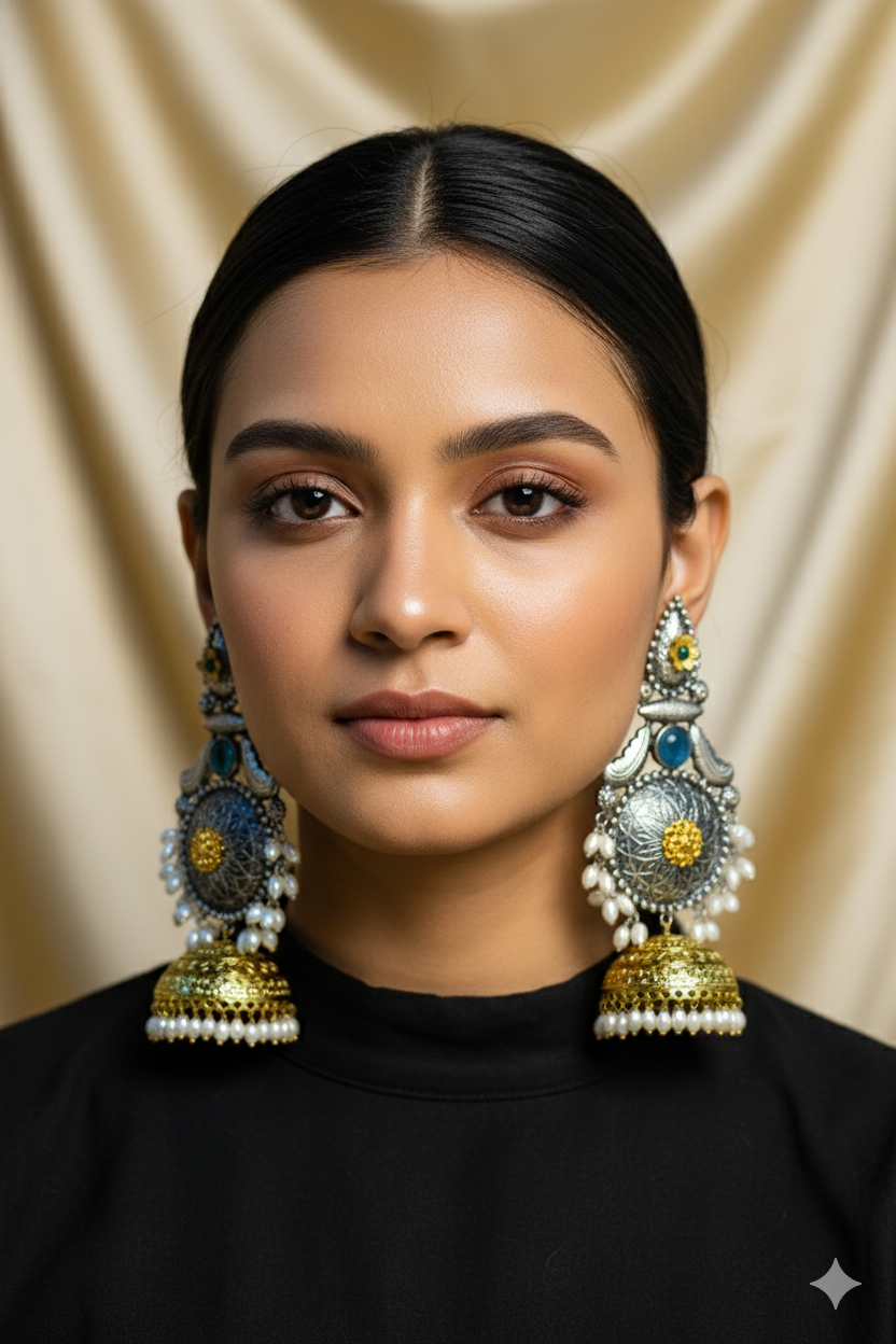 Add a touch of regal charm to your look with these exquisitely crafted antique jhumka earrings. Designed with intricate silver-tone detailing, highlighted with a golden floral motif at the center, and adorned with delicate pearl droplets, these earrings exude timeless elegance. The unique blend of oxidized silver and gold plating makes them a versatile piece, perfect for both festive occasions and traditional wear.