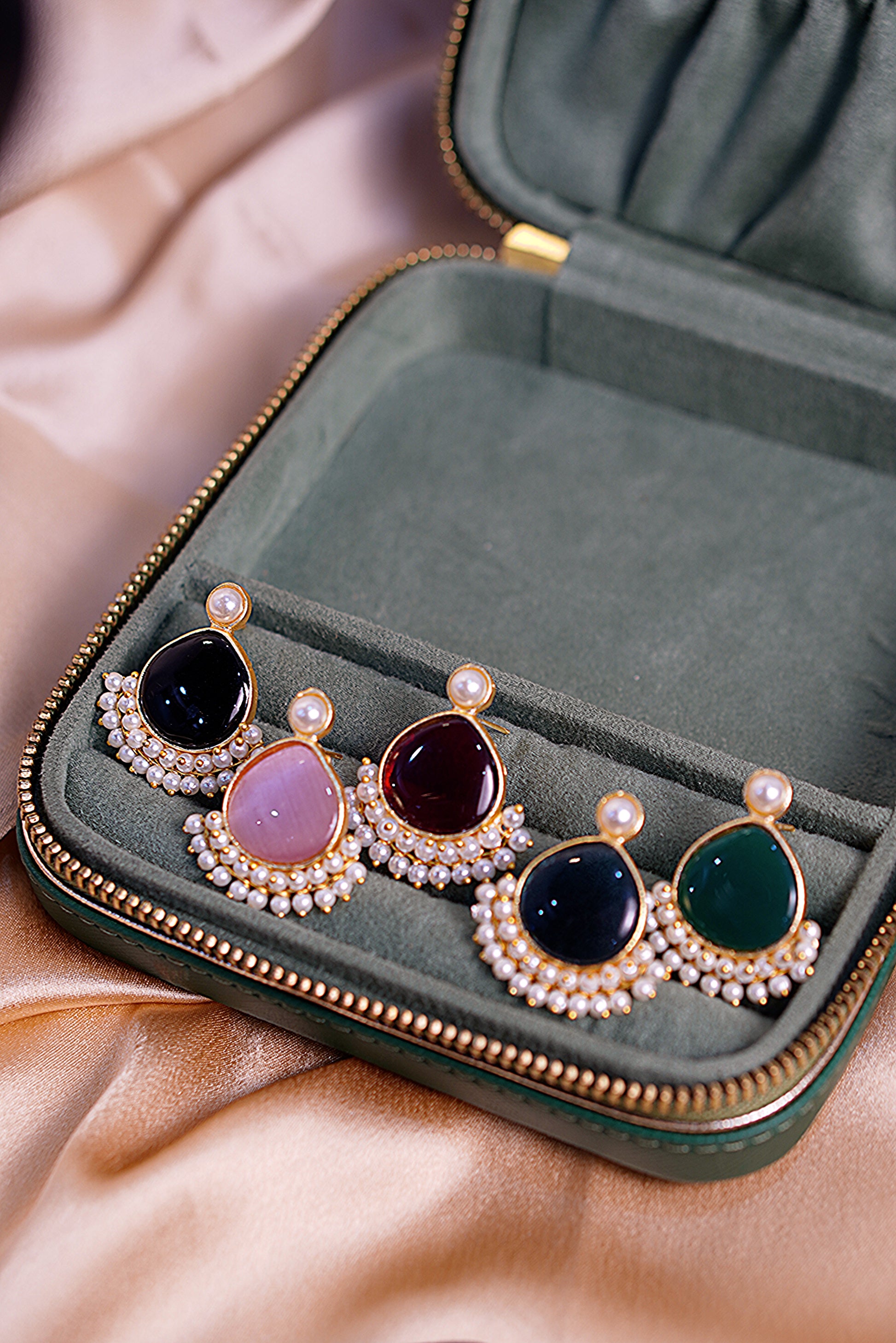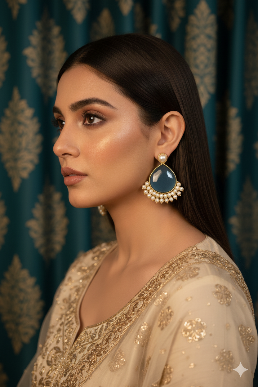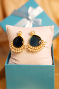 Add timeless elegance to your look with these exquisite black and gold earrings. Designed with a bold teardrop stone at the center, surrounded by delicate golden details and pearl accents, this piece strikes the perfect balance between tradition and modern sophistication. Lightweight yet striking, these earrings are ideal for festive celebrations, weddings, or evening parties—making you shine with every turn.