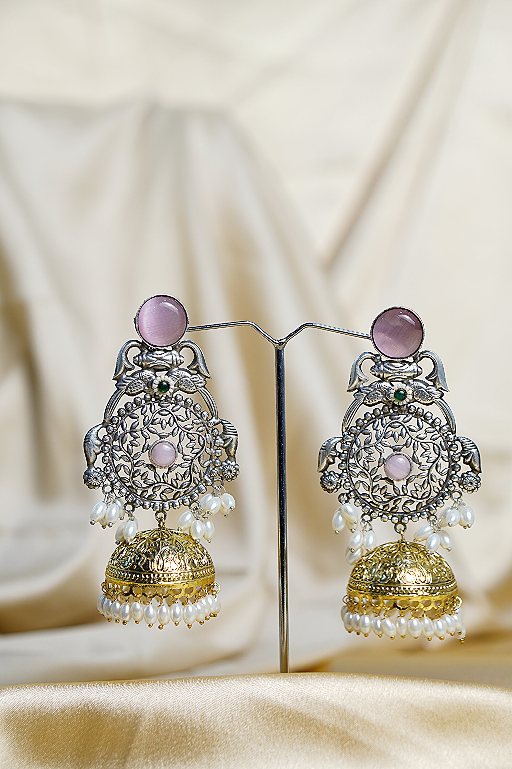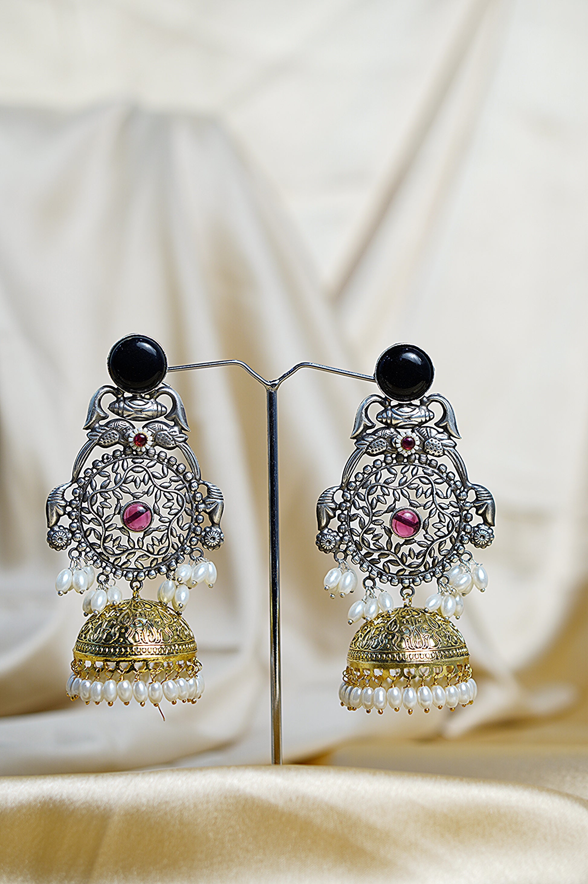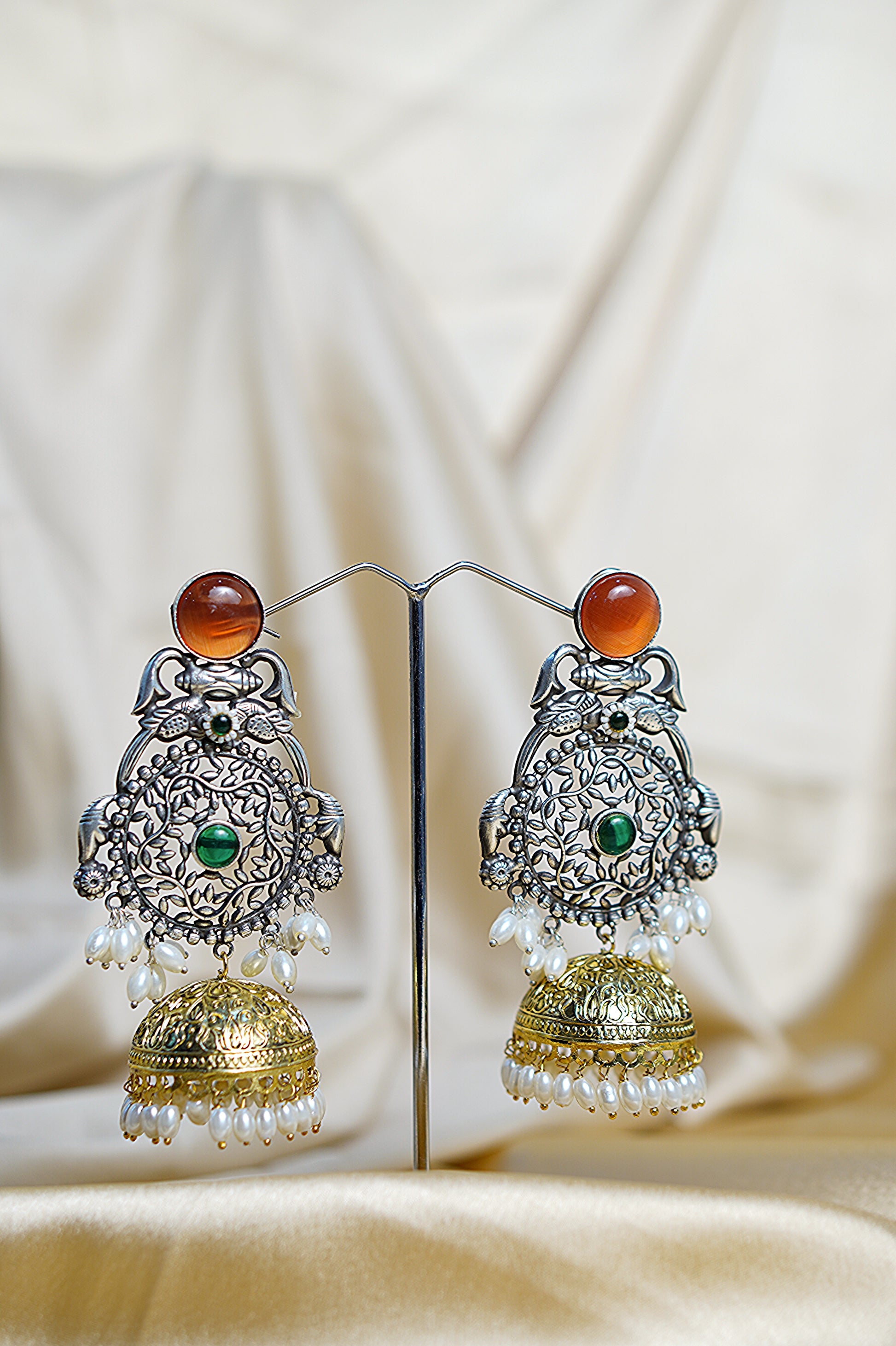 Add a regal charm to your ethnic look with these dual-tone oxidized silver and gold jhumka earrings. The top features a glossy amber gemstone, leading into intricate floral filigree work centered with a stone. The gold-finished jhumka dome is adorned with delicate pearl droplets, creating a perfect balance of tradition and sophistication. Ideal for festive occasions, weddings, and cultural celebrations, these earrings beautifully blend antique artistry with modern elegance — a true statement piece for your jewellery collection.