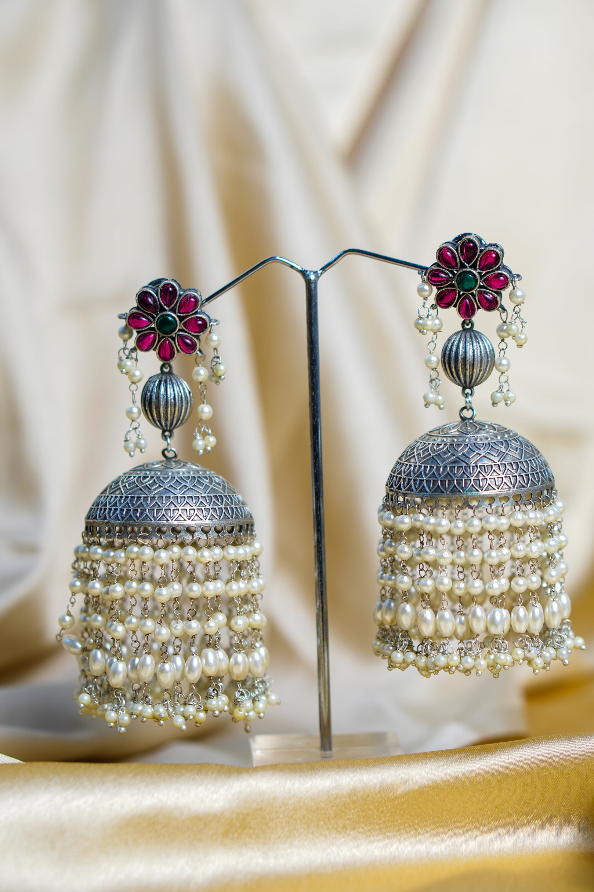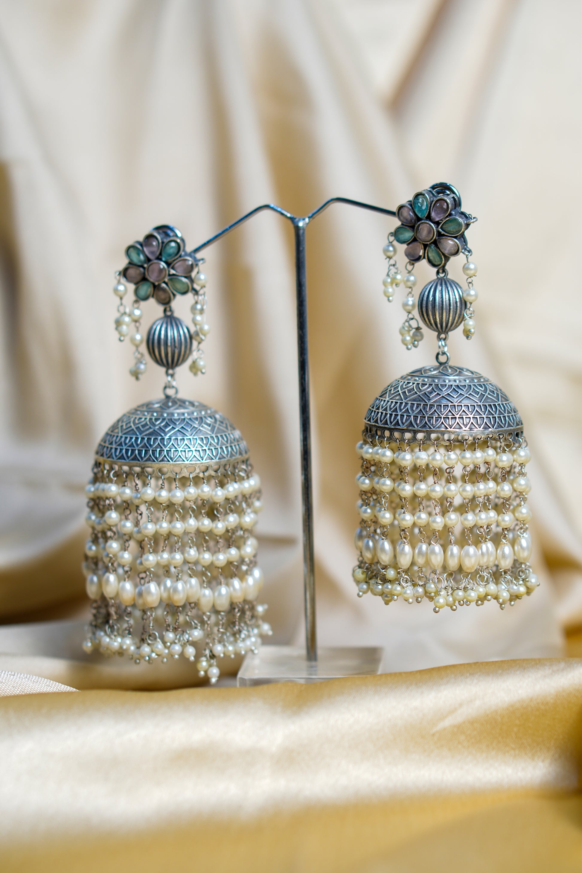 Elevate your ethnic elegance with these handcrafted statement jhumka earrings, designed to bring timeless charm to any occasion. The earrings feature a floral stud encrusted, beautifully paired with intricately carved silver domes. Cascading layers of lustrous pearls add movement and grandeur, making them perfect for weddings, festive celebrations, and special gatherings.